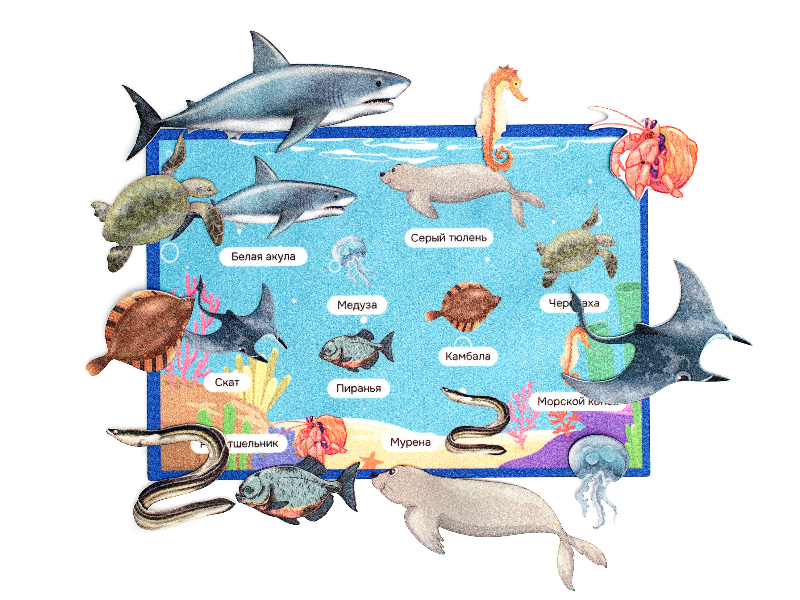 Игровое поле с карманом 28х20 см. Фигурки обиталелей океанариума - 10шт.