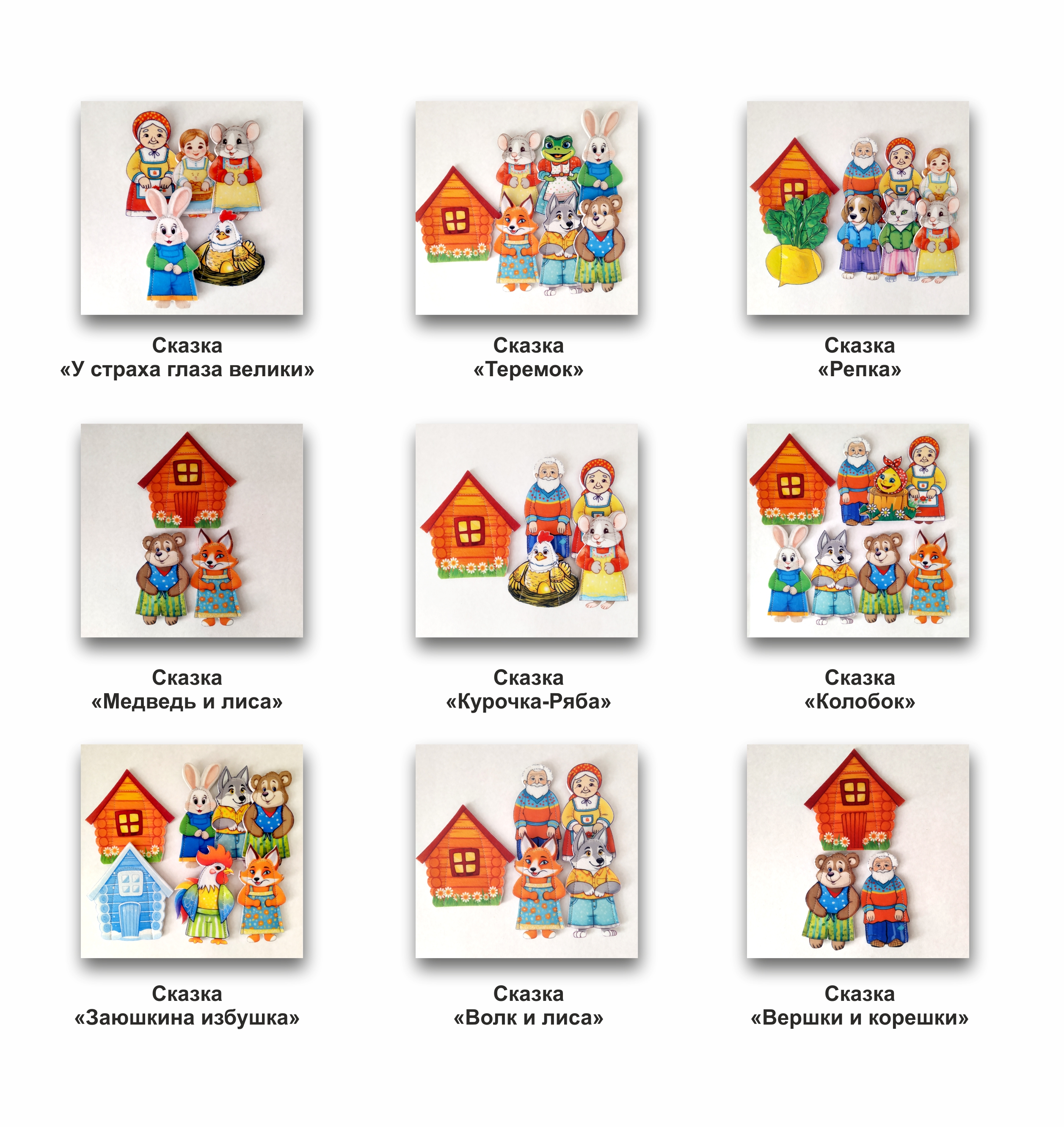 Из них можно составить такие сказки: Теремок, Репка, Колобок, Лиса и Медведь, Вершки и корешки (Мужик и Медведь), Волк и Лиса, У страха глаза велики, Заюшкина избушка, Курочка ряба.