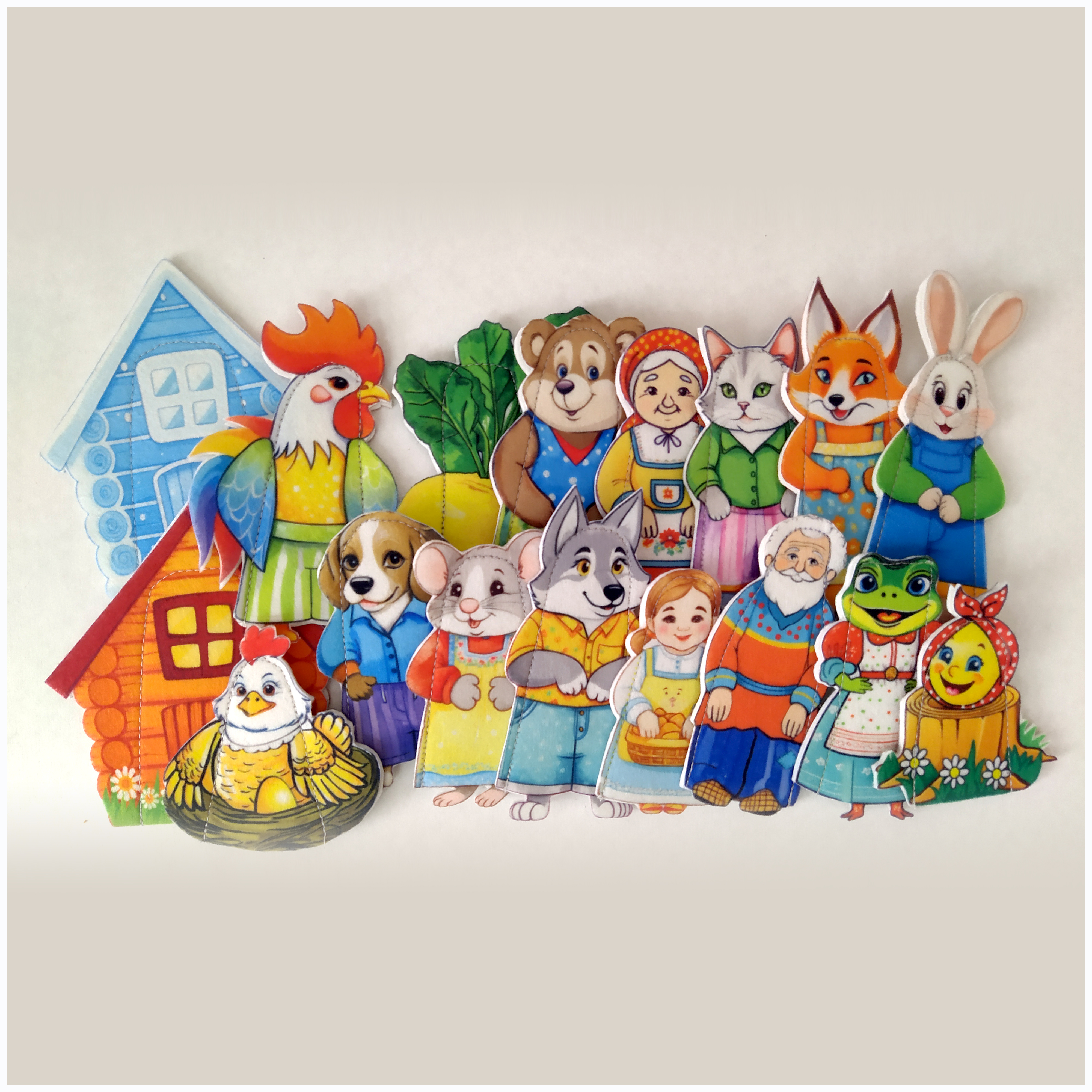 Персонажи, входящие в состав пальчикового театра «9 сказок», — дед, бабка, внучка, колобок, заяц, лиса, медведь, волк, петух, собачка, кошка, мышка, лягушка, курочка, репка и 2 избушки.