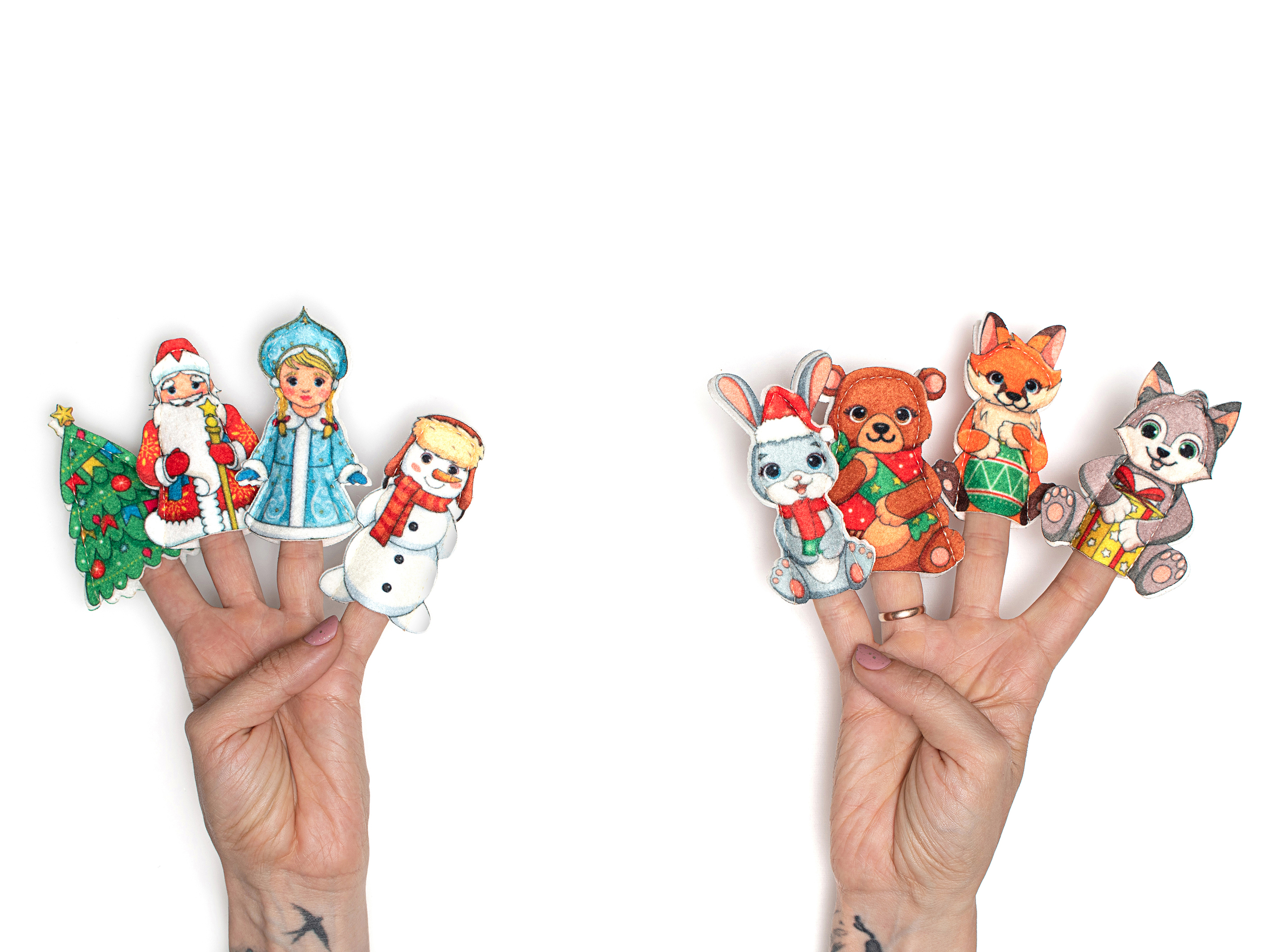 Герои новогодних праздников - 8шт. Елочка, Дед Мороз, Снегурочка, Снеговик, Зайка, Волк, Лисичка, Медведь. Высота фигурки 7 см.
