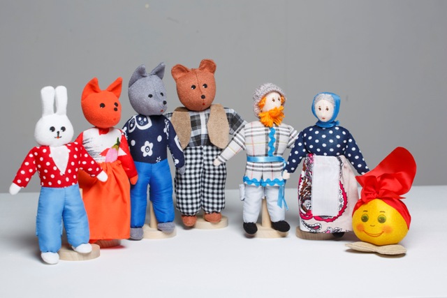 Перед вами – шагающий театр «Колобок», в который входят следующие персонажи: заяц, лиса, волк, медведь, дед, баба, колобок.
