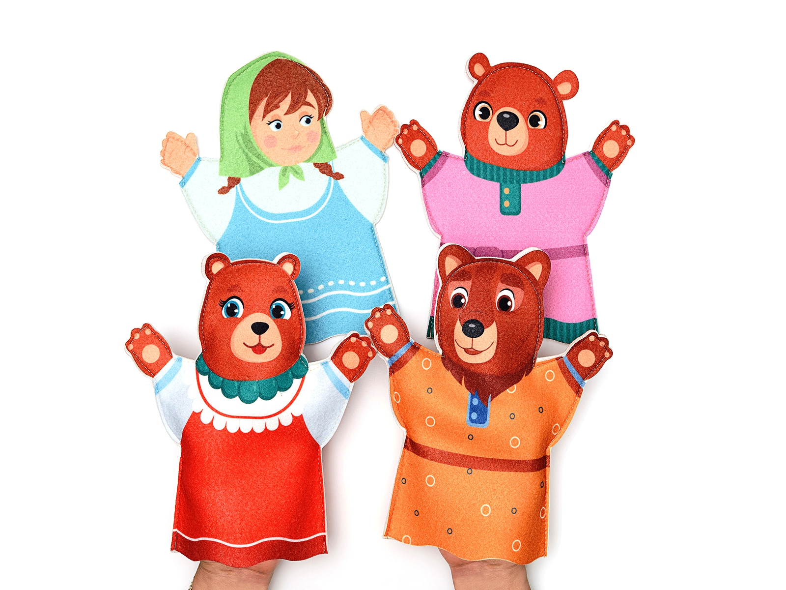 Четыре персонажа из сказки три медведя на руку 23см. Маша,медведь-3шт.