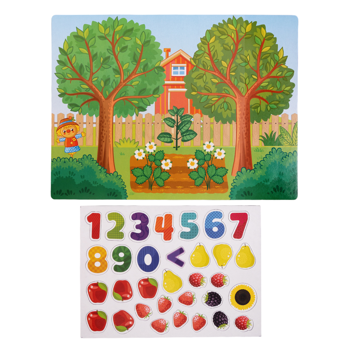 Игровое поля изготовлено из магнитомягкого железа. С одной стороны – доска для математических вычислений, с другой – изображение огорода. Научите ребенка считать на реальных примерах: расставьте магнитные элементы фруктов и ягод на свои места и предложите малышу посчитать количество плодов. Продолжайте развивать навык счета на другой стороне игрового поля, составляя математические примеры.