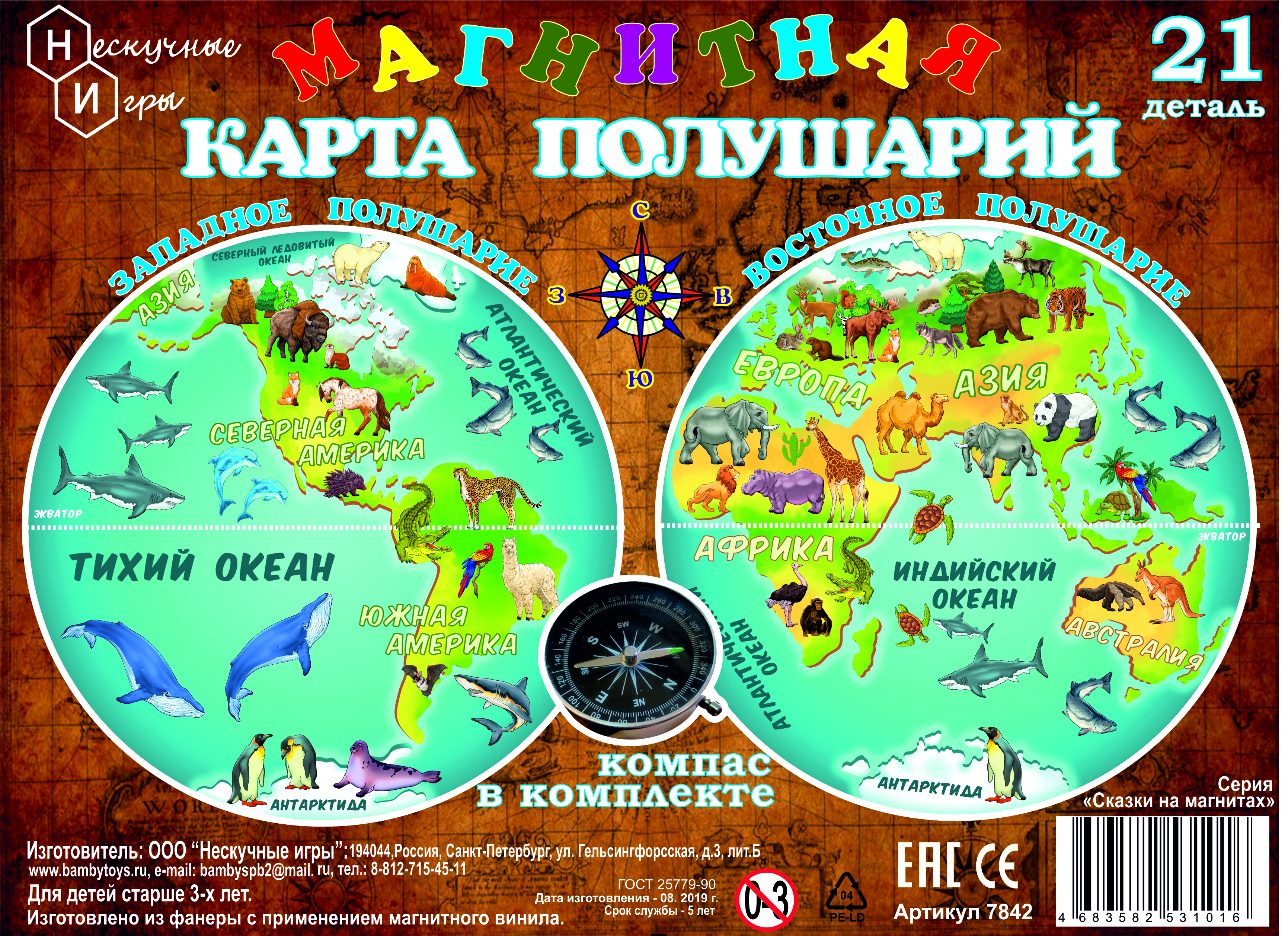 Магнитная карта полушарий (дерево) 21 деталь