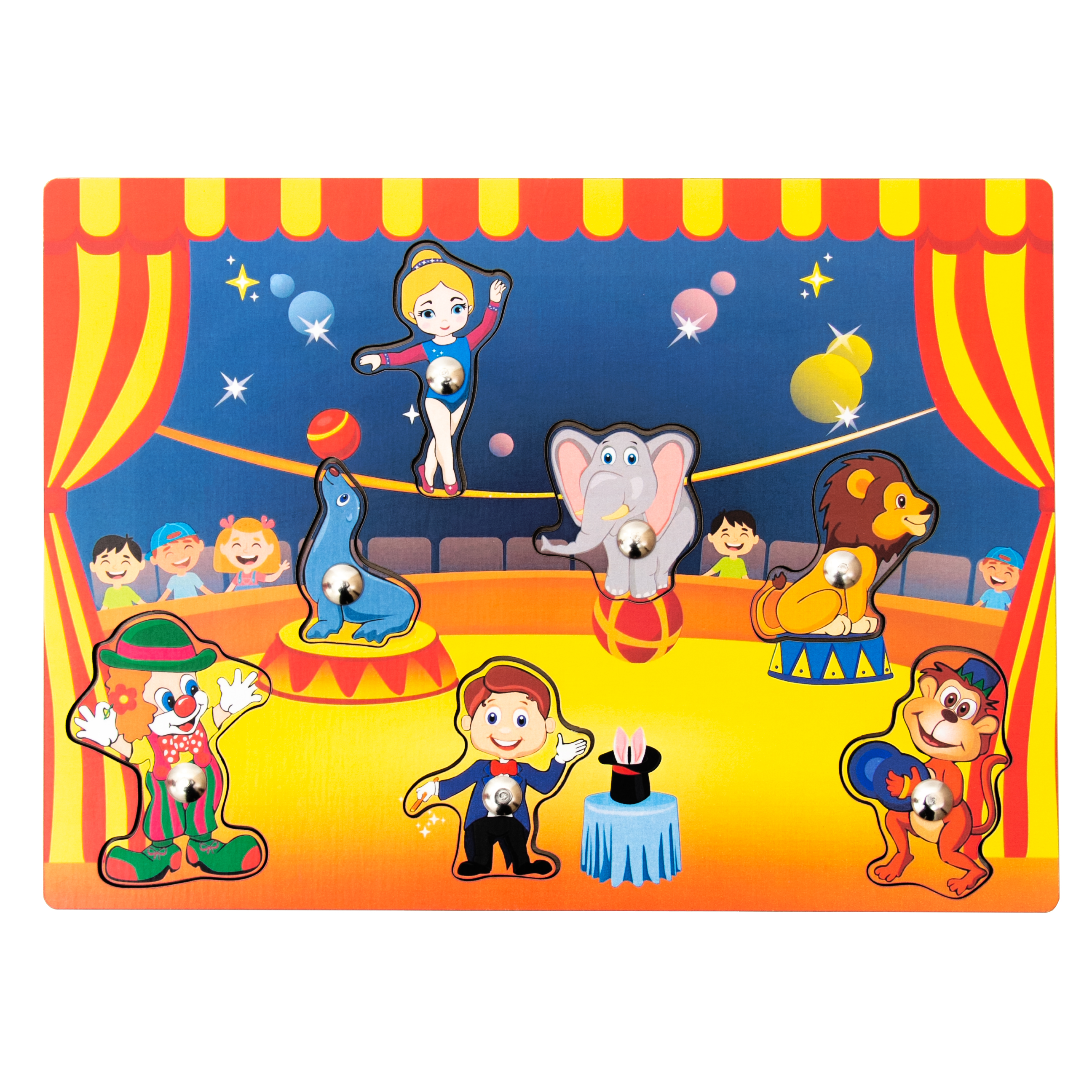 Фигурки на магнитах: Фокусник, гимнастка, клоун, обезьянка, слон, лев и тюлень.