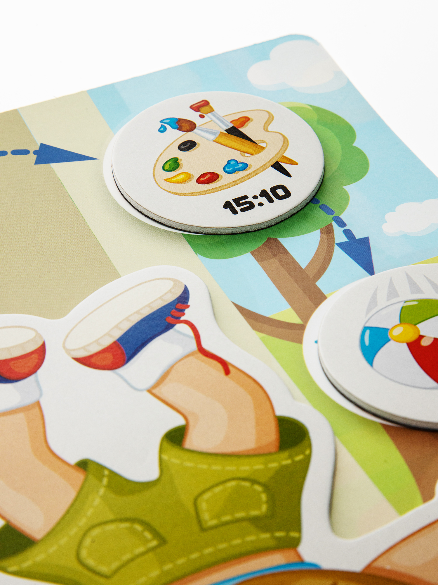 • магнитные жетоны с изображением времени и предметами для каждого времени суток – 18 шт. (диаметр 5,3 см)
