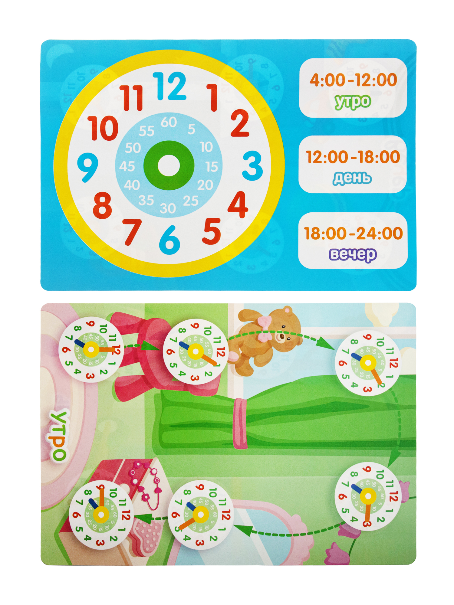 • игровые поля из тонкого пластика с изображением утра, дня, вечера и циферблата часов – 4 шт. (21х30см)