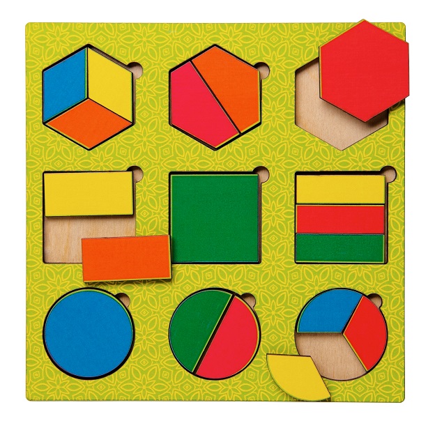 Основная задача - подобрать к данной рамке свой вкладыш. Рассказать ребенку о том, что одну геометрическую фигуру можно разделить на две, три части разными способами.
