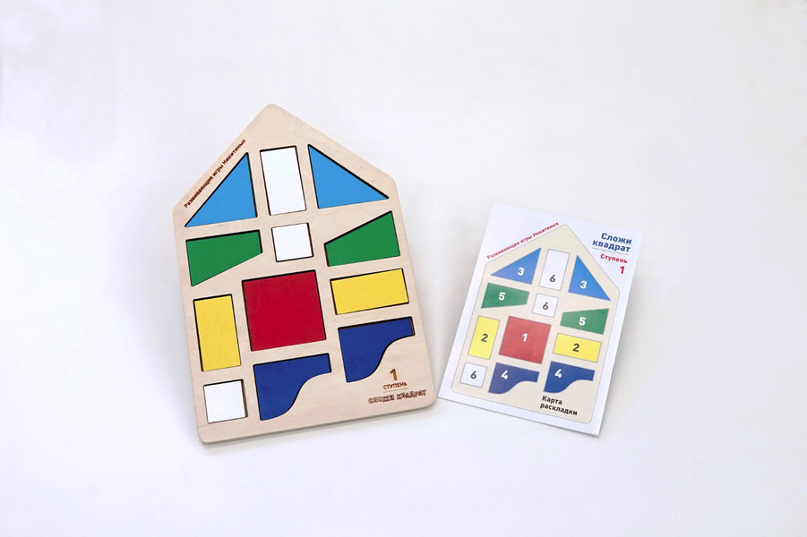 Новое исполнение одной из самых популярных игр Никитиных. Ступень 1 (1 уровень сложности). 6 разноцветных квадратов-головоломок, разрезанных разными способами на 2-3 части. Деревянный планшет - "домик" - это методически правильная упаковка, где фрагменты квадратов хранятся в разобранном виде. В комплект входит подробная авторская инструкция-методика для родителей и педагогов, картонный пенал для хранения и карта раскладки с нумерацией заданий.