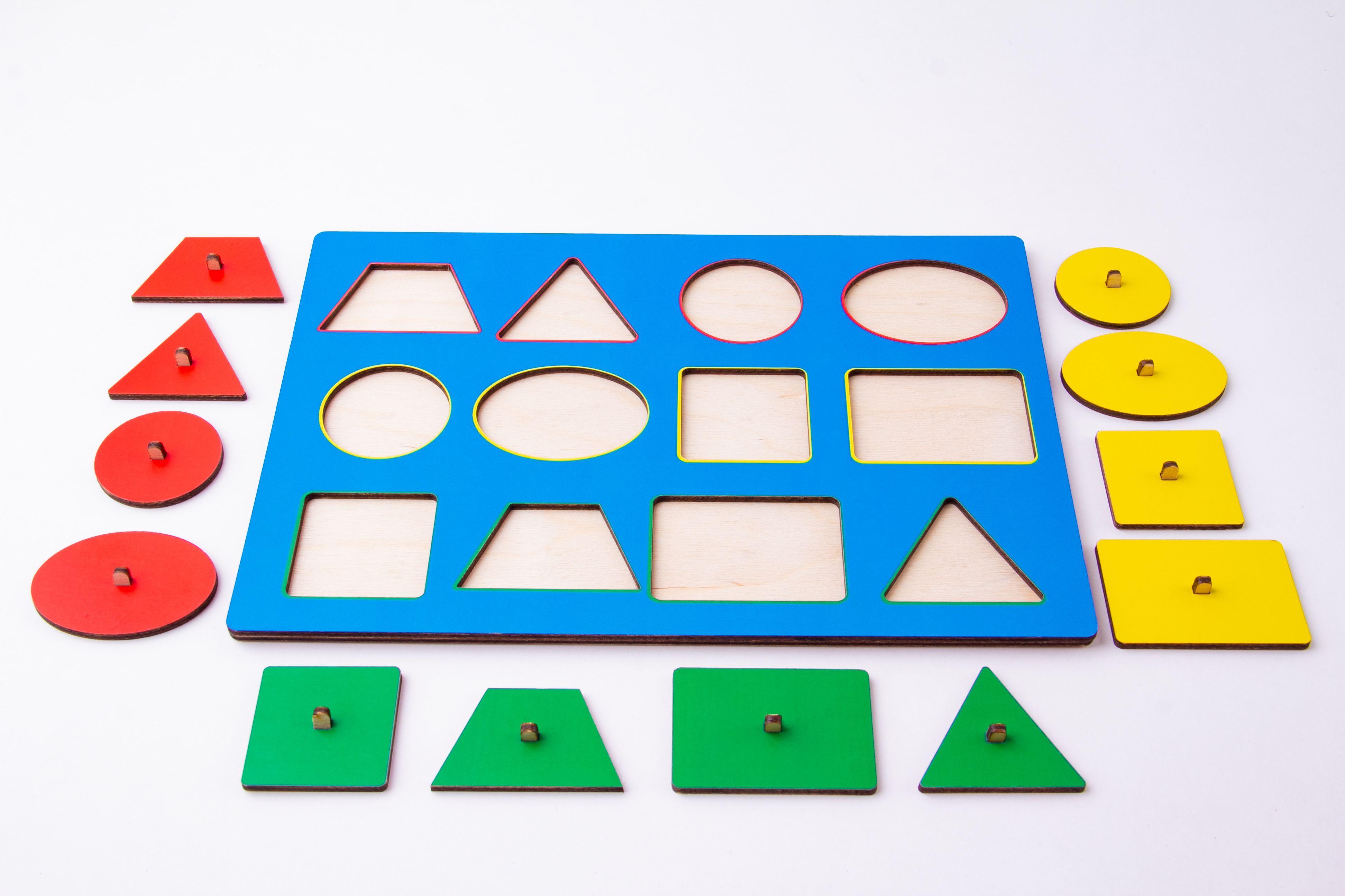 Деревянная панель с рамками – геометрическими фигурами– 1 шт. Панель содержит геометрические фигуры разных цветов с ручками.