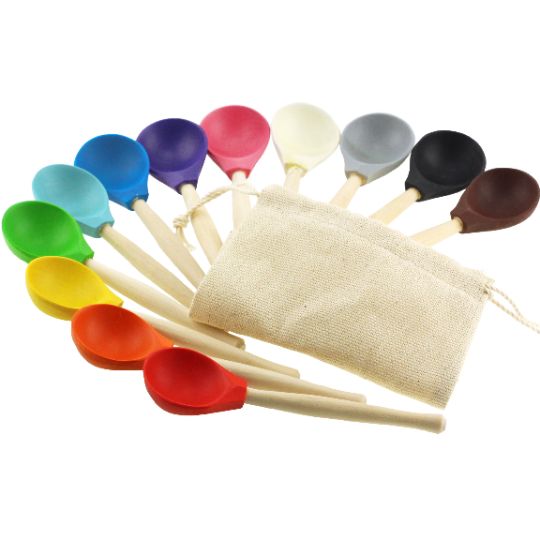 В наборе 12 деревянных ложек разных цветов длиной 14 см, поднос для удобного хранения. Основная задача - сортировать разные предметы по цветам, подобрав для этого подходящую ложку. Для расширения игры хорошо подойдут цветные шарики, чашечки или тарелочки.