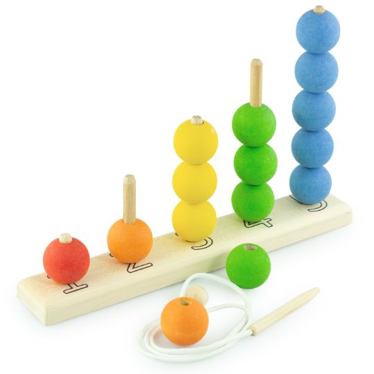 Сочетает в себе пирамидку, сортер и шнуровку. Нанизывая шарики разных цветов на стержни, ребенок разовьёт навык счёта, научится сравнивать предметы между собой по цвету и количеству. Состав набора: деревянное основание со штырьками, 15 бусин, шнурок с деревянным наконечником.