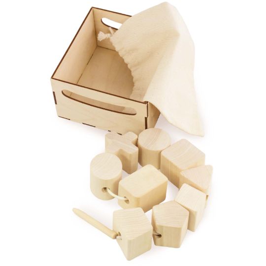 Фигуры разной геометрической формы естественного природного цвета - цвета дерева. Базовая цель игры - нанизывание фигурок на шнурок с помощью деревянного наконечника. А еще можно развивать воображение и раскрашивать эти предметы самостоятельно. Состав: 9 фигур разной формы, веревочка с наконечником; мешочек, деревянный поднос. Размер фигур 35х55 см.
