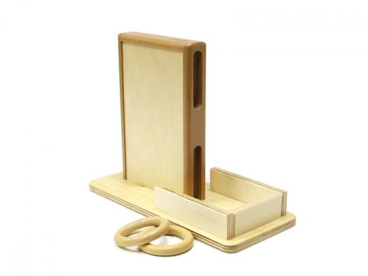 Коробочка с двумя прорезями закрепленная на подносе. В комплекте два деревянных колечка.
