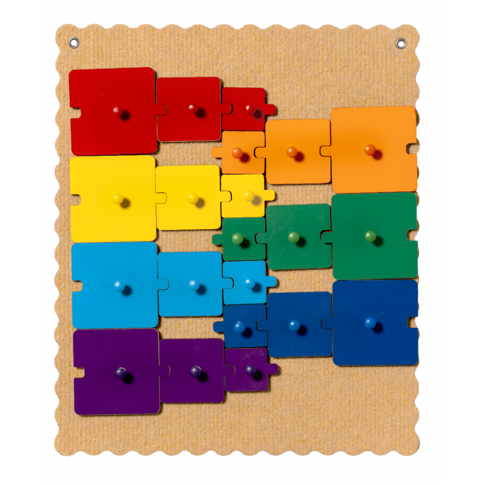 Игра крепится к стене, что делает игру незаменимой как для индивидуального домашнего использования, так и для проведения групповых развивающих занятий в детских садах. Направлена на развитие сенсорных способностей (размер, цвет), творческое конструирование, развитие моторики руки, формирование пространственных представлений, математических понятий.