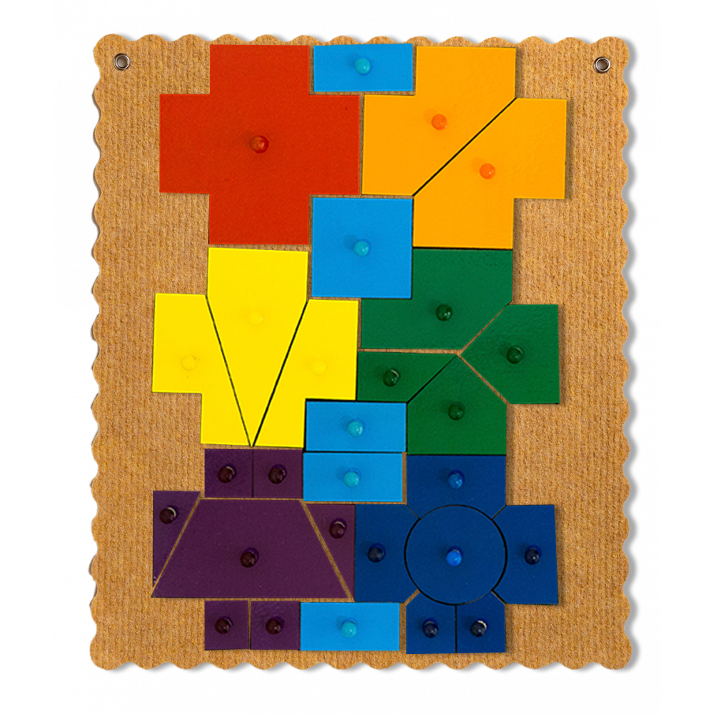 Состав: 7 фигур в форме крестика (фанера, цветная пленка): 1 целая и 6 составных. Фигуры снабжены держателями и липучкой для закрепления на Коврографе; подложка (280х380 мм, ковролин); альбом фигурок.