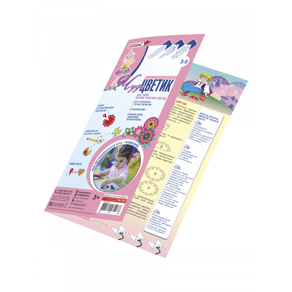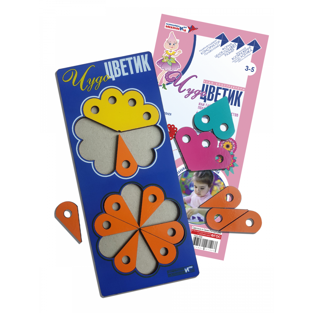 Состав: Поле (120х240 мм, фанера, цветная пленка);Составные фигуры-вкладыши в форме цветка (фанера, цветная пленка): 1 - из 10 лепестков, 2 - из 4 неравных частей ("двудолька", "трехдолька"и т.д.;альбом фигурок.
