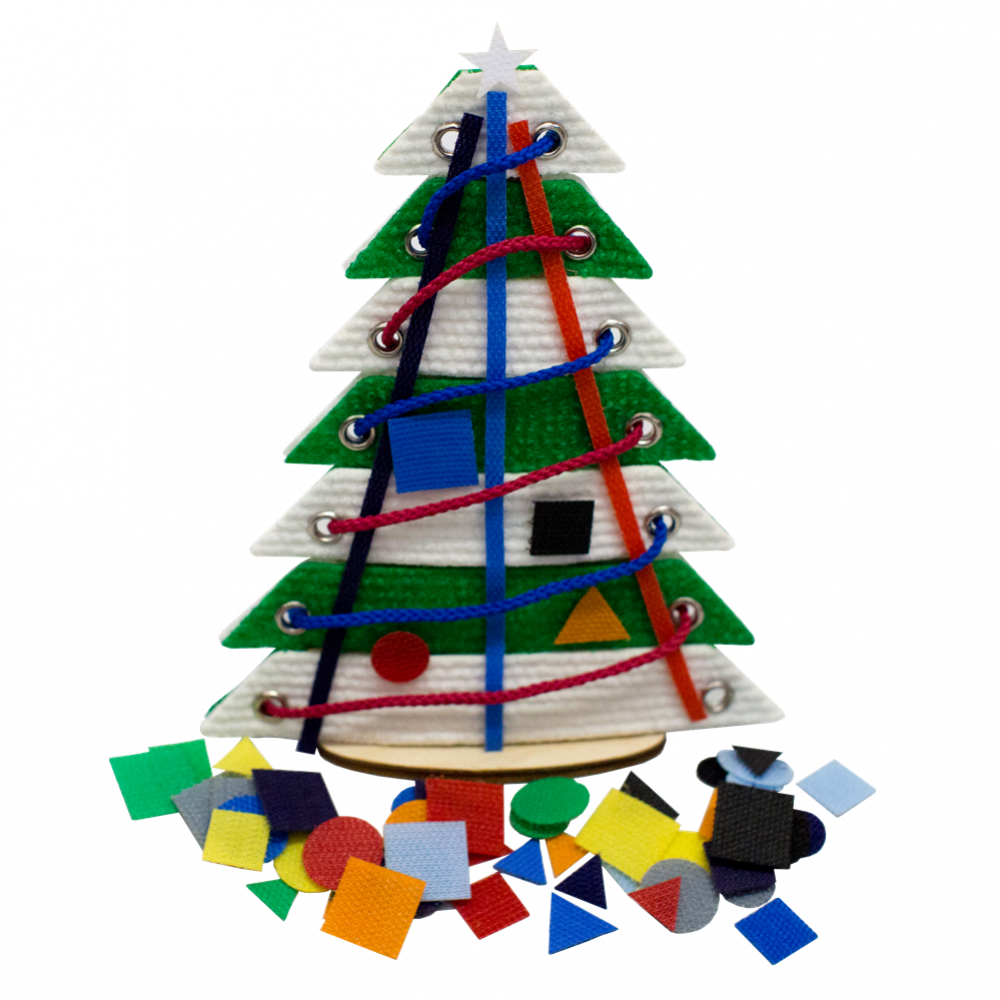 Состав: Инструкция; 2 шнурка; пакет с липучками (63 геометрических элементов 2 размеров, 9 -ти цветов); елочка из 7 веточек - 18см; 3 липкие веревочки; ось и подставка из фанеры. Размер: 26*15