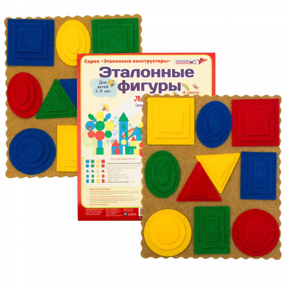 Состав: 1. Фигуры из ковролина 3-х размеров (сторона 100мм, 75мм, 50мм), 4 цветов (красный, желтый, зеленый и синий): - квадрат – 12 шт.; - круг – 12 шт.; - треугольник – 12 шт.; - прямоугольник – 12 шт.; - овал – 12 шт. 2. Ковролиновая основа – 2 шт.