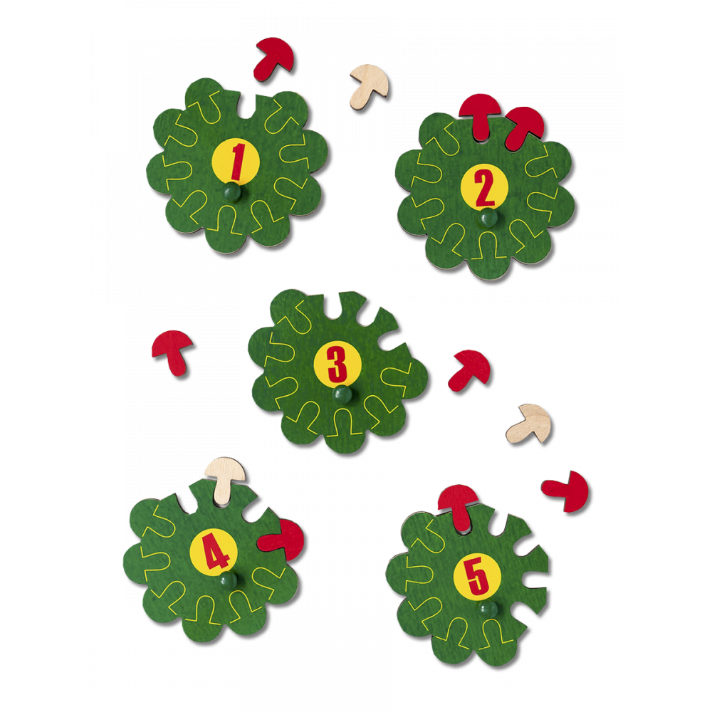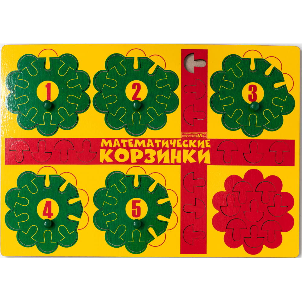 Состав: Игровое поле (210х297 мм, фанера, цветная пленка, шелкография) с вкладышами – 5 «корзинок» и 21 «грибок» (фанера, цветная пленка, шелкография).