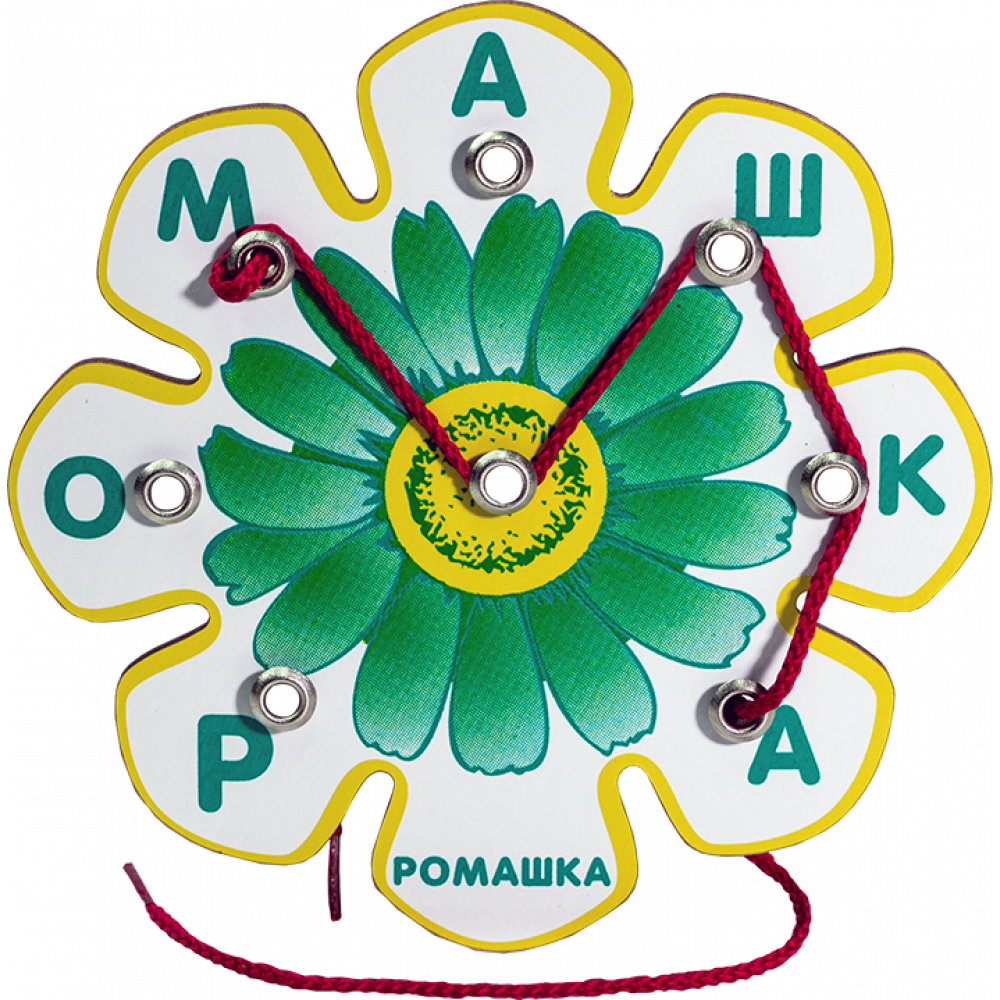 Состав: Игровое поле (150х150 мм, фанера) в виде ромашки, на поле написано слово РОМАШКА, нарисована «звездочка» (заменитель любой буквы) и под каждым знаком закреплена кнопка; цветной шнурок; инструкция.
