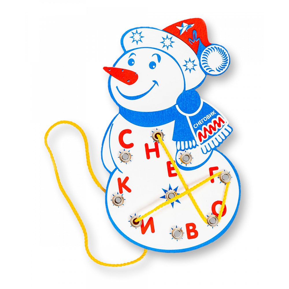 Состав: Игровое поле (235х140 мм, фанера) в виде снеговика, на поле написано слово СНЕГОВИК, нарисована «звездочка» (заменитель любой буквы) и под каждым знаком закреплена кнопка; цветной шнурок; инструкция.