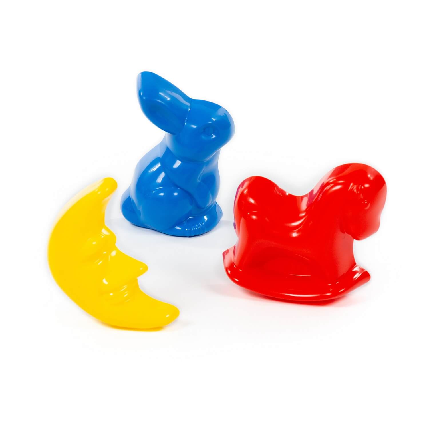 Формочки заяц, лошадка и месяц выполнены из пластика ярких цветов.