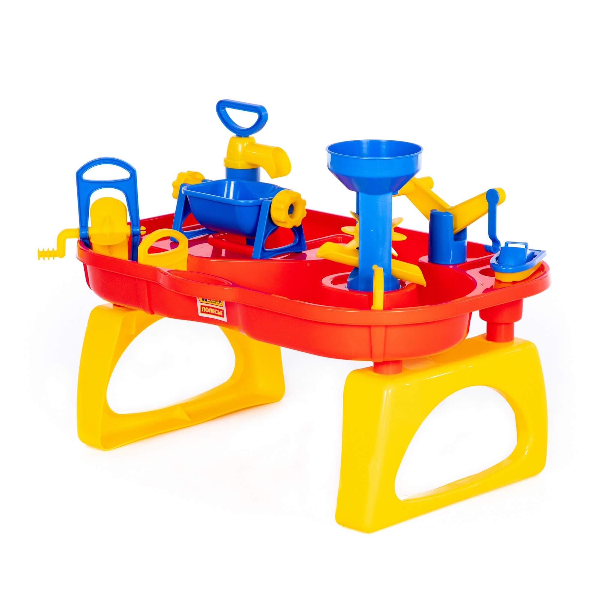 Содержит много элементов для игры с водой: 2 водяных мельницы, водяной насос, которым можно накачать водичку в ковшик, затем вылить обратно, опрокинув ковшик; подъемный кран, которым можно эвакуировать лодку, заслонки для воды.