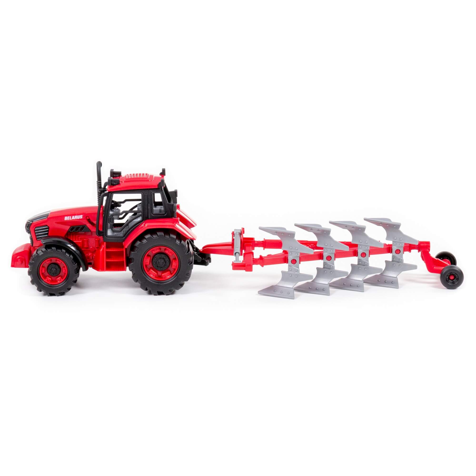 Трактор Belarus – игрушка, изготовленная по лицензии ОАО «Минский тракторный завод». Выпуск трактора приурочен к 75-летнему юбилею завода.Игрушка максимально детализирована и выполнена в узнаваемом цвете сельскохозяйственной техники. Капот трактора может быть зафиксирован в открытом положении для «ремонта» во время игры. Трактор оснащен инерционным механизмом, который повышает проходимость на разных поверхностях. Наличие прицепа с плугом, «рабочие» стороны которого можно менять, позволит разнообразить сценарии детских игр. Взаимодействовать с игрушкой увлекательно как дома, так и на свежем воздухе. Продается маленький аналог большой спецтехники в красочной коробке.
