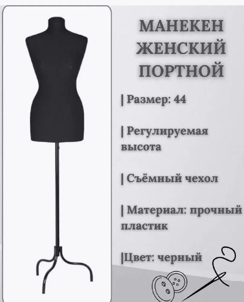 Портновский манекен 42-44 размера на металлической подставке. Пластиковый манекен с текстильным чехлом черного цвета. Регулируемый по высоте.