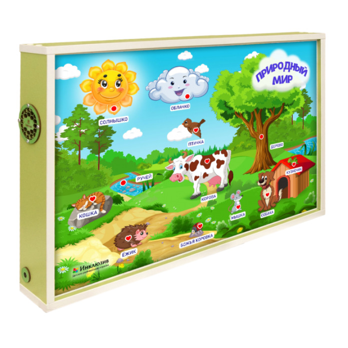 1. Габаритные размеры: 72х51,5х8см. 2. Цвет торцевой части: зеленый. 3. Звуковоспроизводящий динамик и разъем под питание: Наличие на боковой стороне панели. 4. Материал изготовления: ЛДСП, оргстекло с УФП нанесением на лицевой стороне. 5. Количество озвучиваемых (интерактивных) элементов: 12 шт. 6. Количество элементов с подсветкой: 3 шт. 7. Сенсорные датчики: 12 шт. 8. Питание от сети 220В. 9. Программируемый электронный модуль. 10. Количество животных, изображенных на лицевой стороне панели, имеющих теплочувствительный датчик обозначенный элементом в виде сердечка: 8 шт.