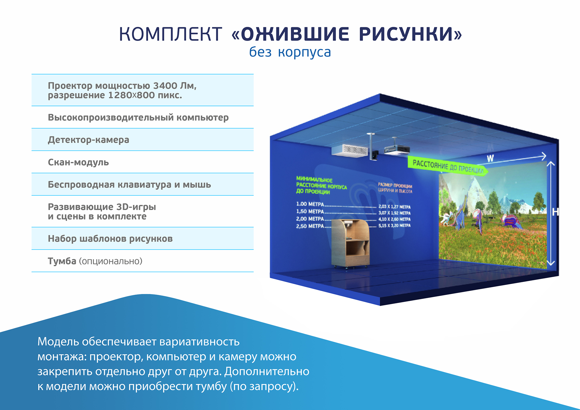 Состав 1. Компьютер + кожух для крепления на стене/потолке 2. Проектор + потолочное крепление 3. Сканер 4. Пульт к проектору 5. Лазерный датчик 6. Беспроводные клавиатура и мышь 7. Технический паспорт 8. ПО Ожившие рисунки 9. Сертификат 10. Гарантийный талон 1 год