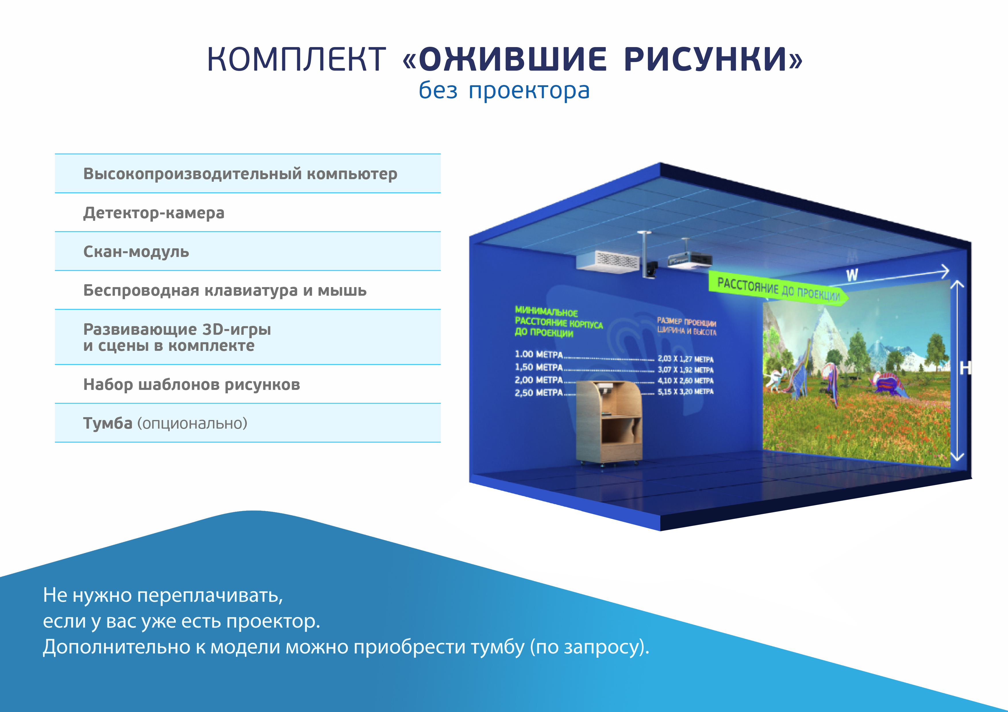 Состав 1. Компьютер + кожух для крепления на стене/потолке 2. Сканер 3. Лазерный датчик 4. Беспроводные клавиатура и мышь 5. Технический паспорт 6. ПО Ожившие рисунки 7. Сертификат 8. Гарантийный талон 1 год