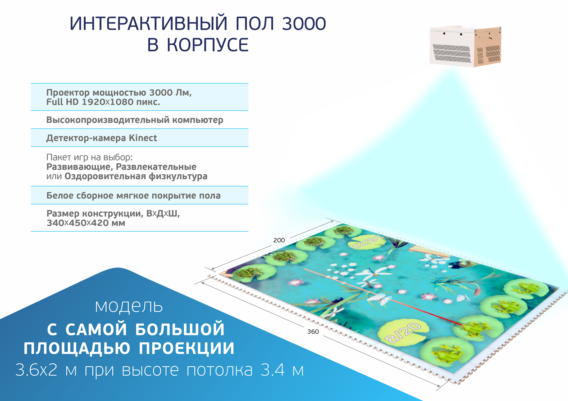 Интерактивный комплект оборудования с проекцией на пол и обратной связью на действия детей на этой проекции. Продукт востребован в дошкольных образовательных учреждениях, развивающих центрах, а также в игровых комнатах и парках.