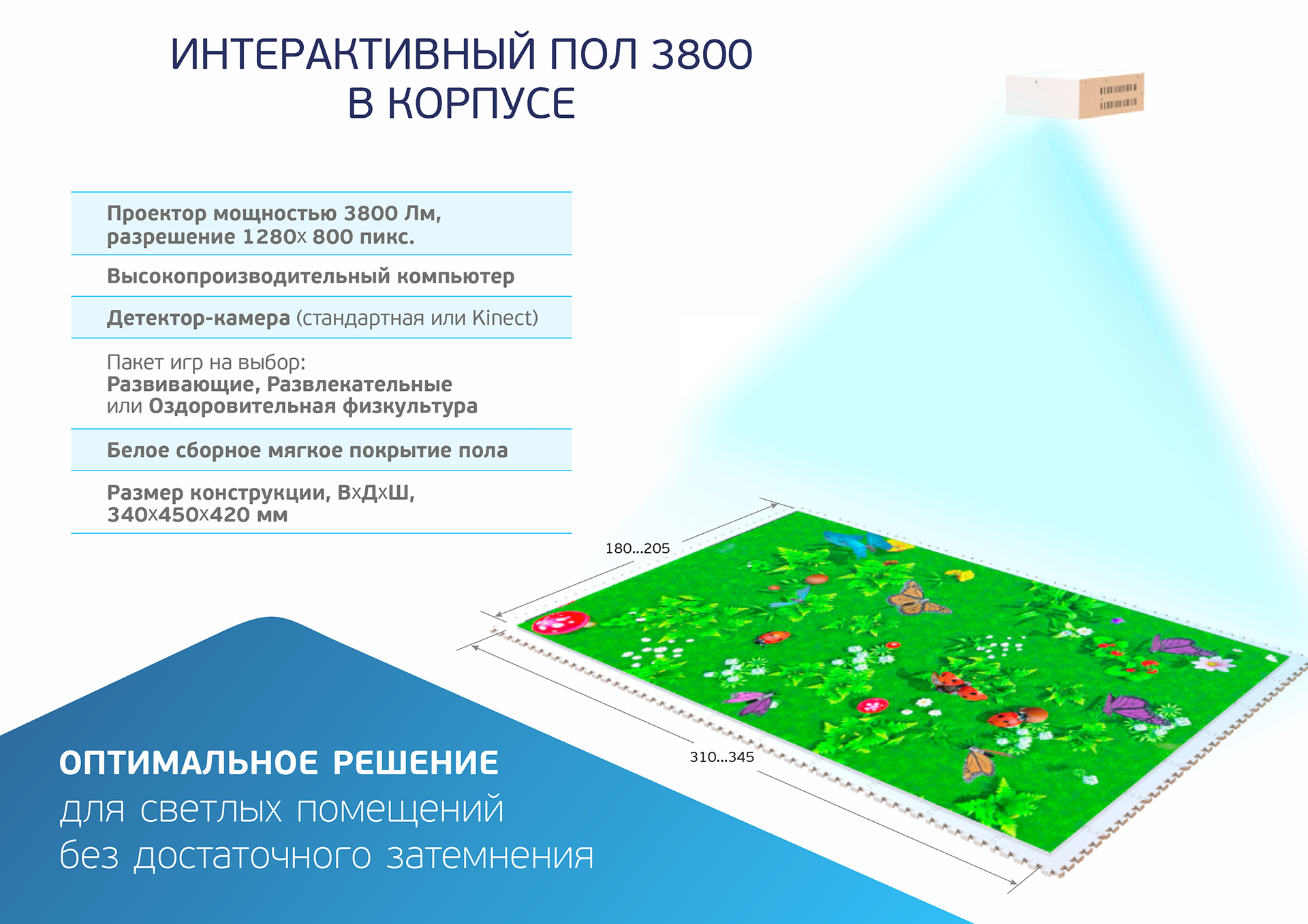 Интерактивный комплект оборудования с проекцией на пол и обратной связью на действия детей на этой проекции. Продукт востребован в дошкольных образовательных учреждениях, развивающих центрах, а также в игровых комнатах и парках.