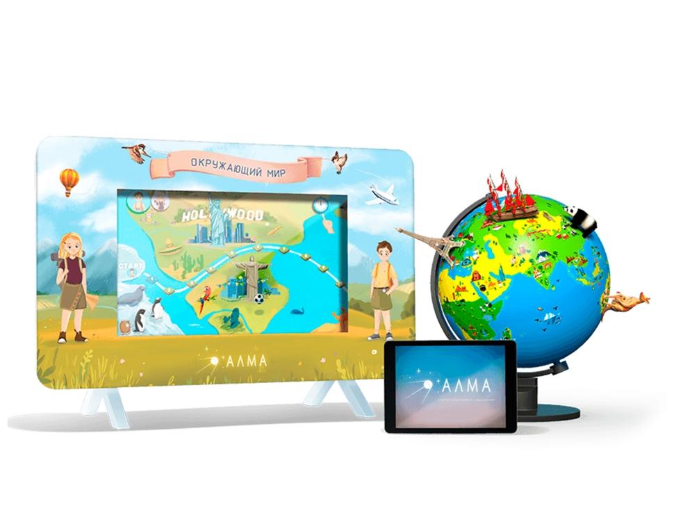 Программное обеспечение « География» в интерактивной игровой форме преподнесёт необходимый географический минимум, а глобус с дополненной реальностью, прилагаемый в наборе, отправит детей в кругосветное путешествие. Стоит только запустить на планшете специальное приложение и навести его на метки, размещённые на глобусе — картинки оживут, и о многих достопримечательностях появится интересная информация.