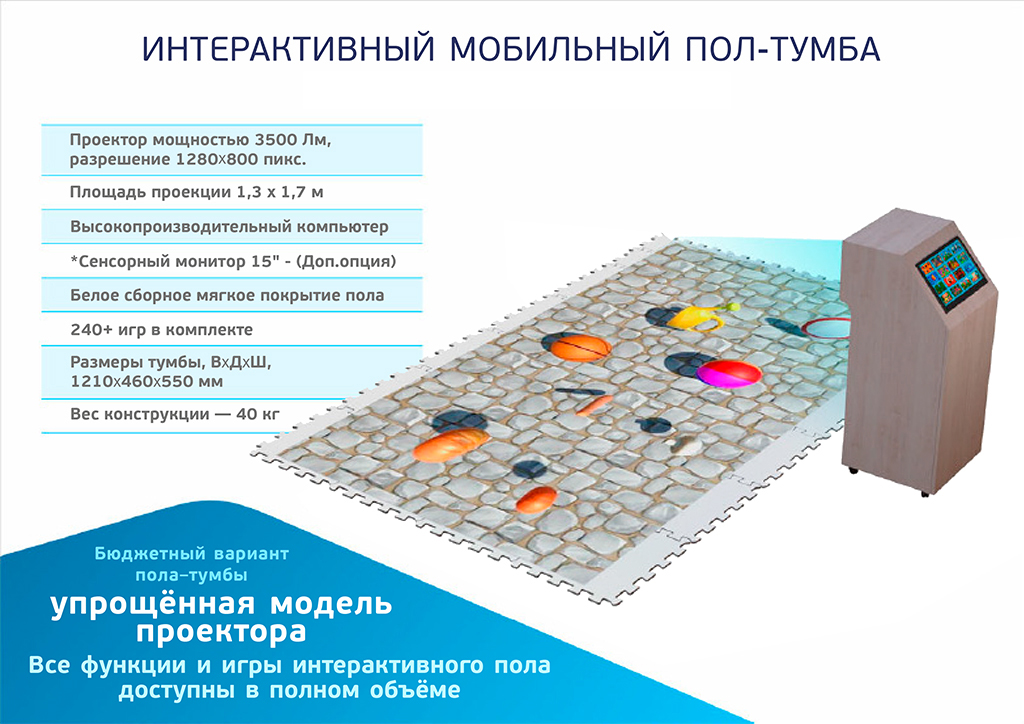 Интерактивный мобильный комплект оборудования с проекцией на пол и обратной связью на действия детей на этой проекции. Данный продукт востребован в дошкольных образовательных учреждениях и развивающих центрах благодаря своей мобильности. Отличие данного пола от стационарного в том, что не требуется монтаж данного оборудования, а благодаря колесикам его удобно перемещать из помещения в помещение.