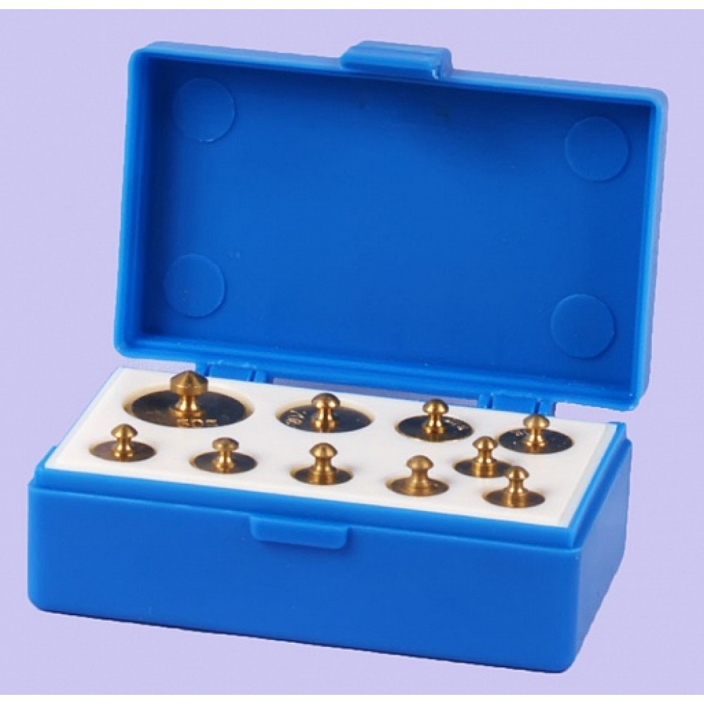 Набор состоит из 10 гирь цилиндрической формы, разных по массе. В комплекте: 2 гири массой 1г, 2 гири массой 2г, 2 гири массой 5г, 2гири массой 10г, гиря массой 20г и гиря массой 50г. На каждой гирьке указана ее масса. Набор упакован в пластмассовую коробку, каждая гирька хранится в своей ячейке.