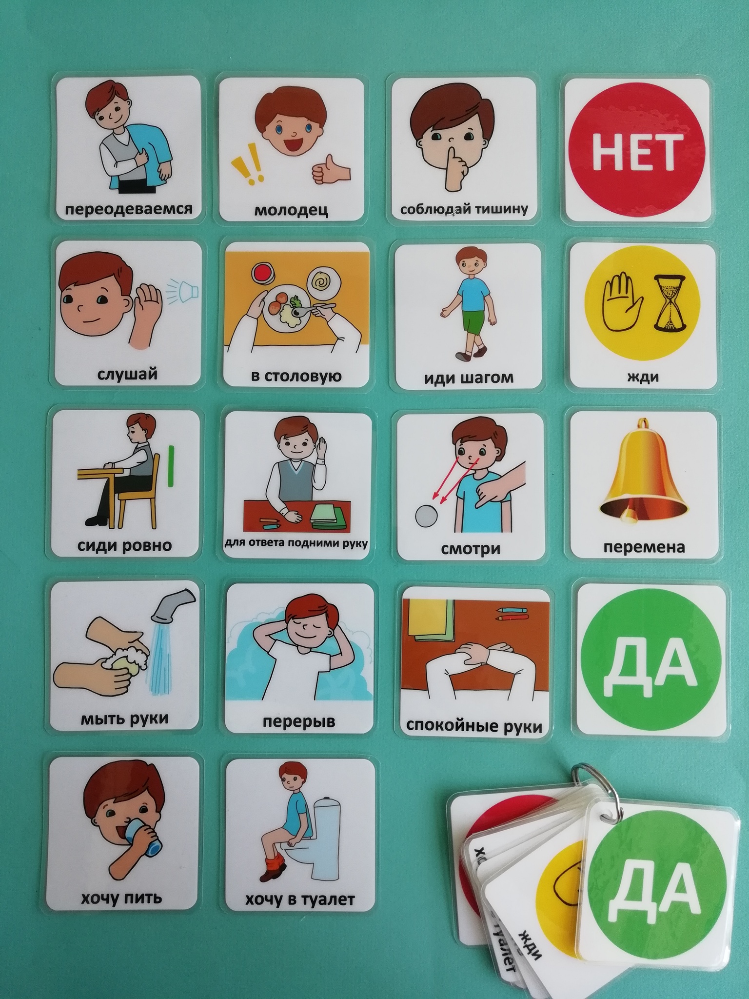 Педагогам и тьюторам может пригодиться визуальный БРЕЛОК, в котором собраны самые необходимые карточки. Например, чтобы показать ученику "соблюдай тишину" или "иди шагом". Иногда это может быть эффективнее, чем вербальные напоминания.