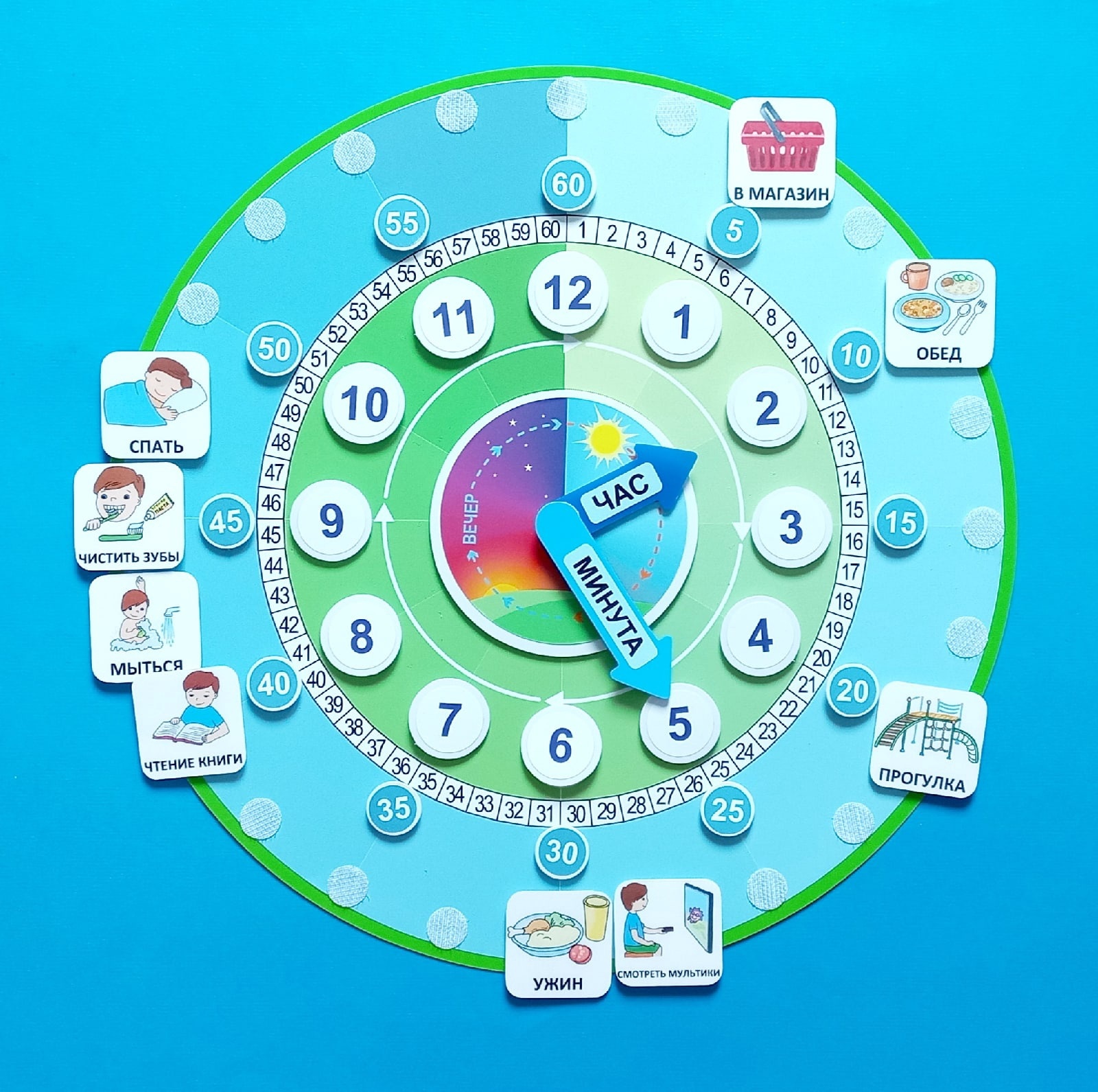 - два табло диаметром 10 см (Ночь-Утро и День-Вечер);