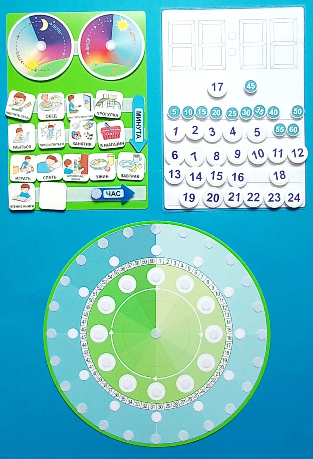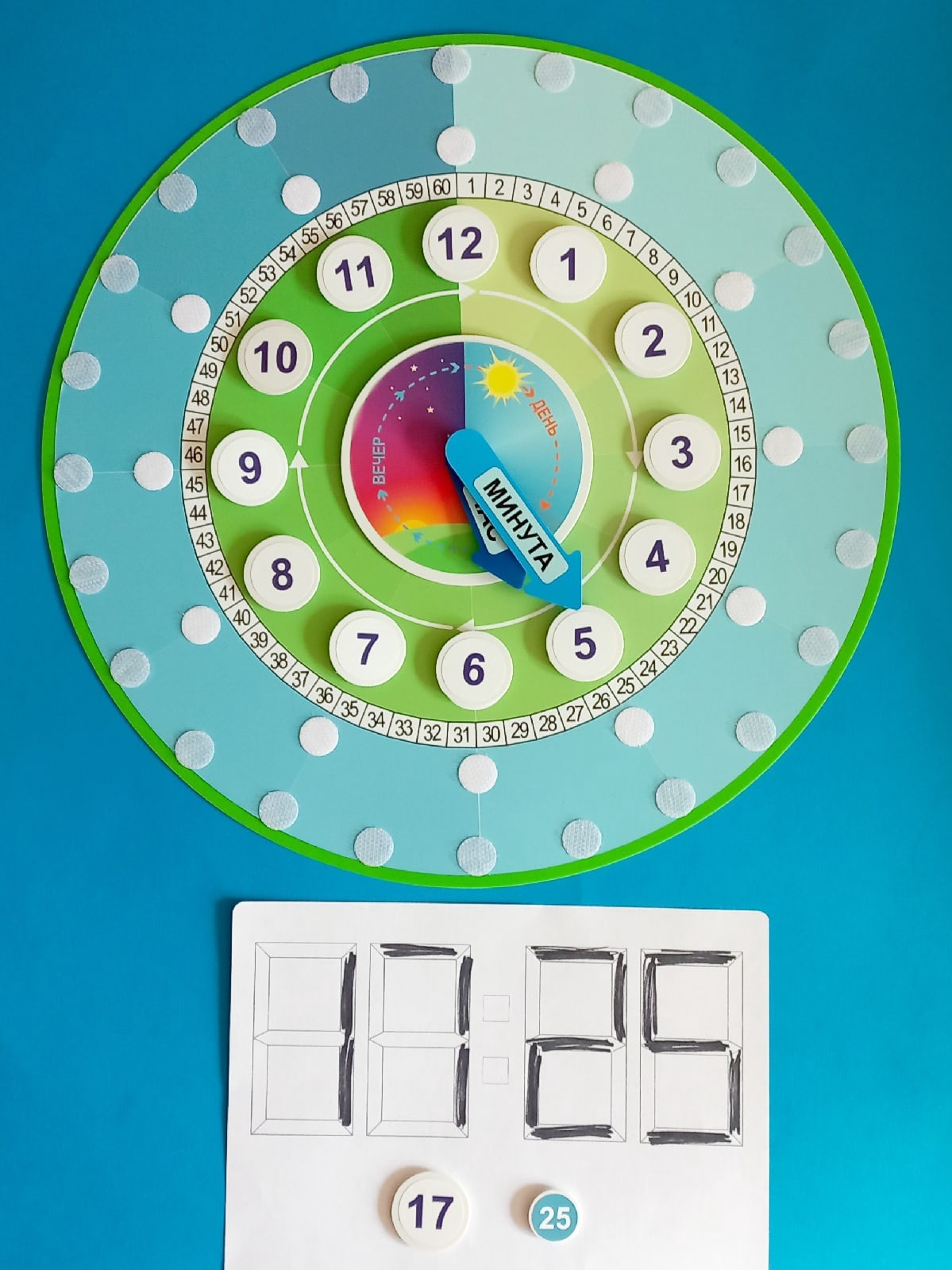 - 24 пластиковые карточки диаметром 3 см (часы 1 - 24);