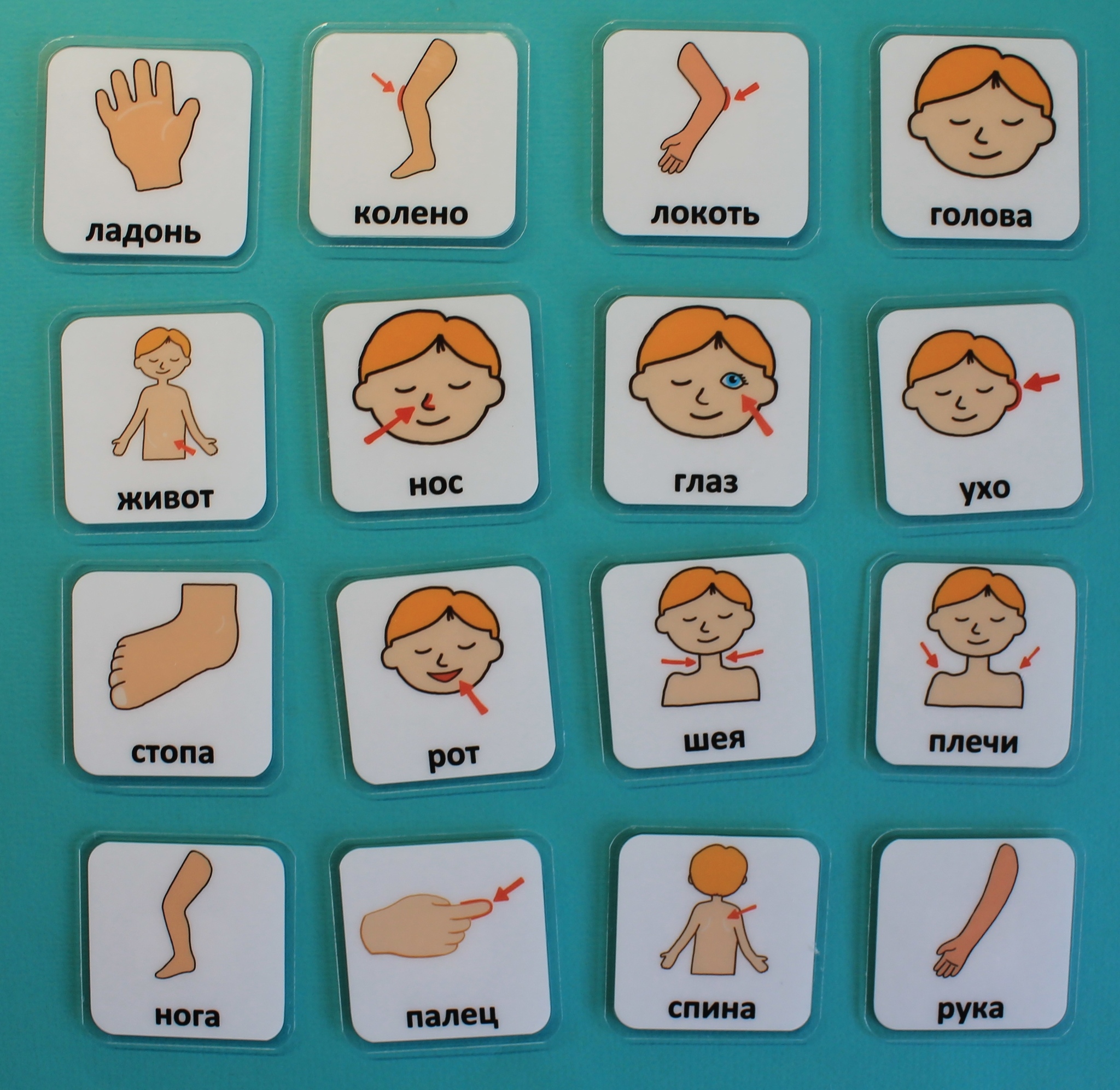 В набор входят: рука, колено, локоть, ладонь, нога, палец, голова, нос, ухо, стопа, шея, глаз, живот, спина, плечи, рот