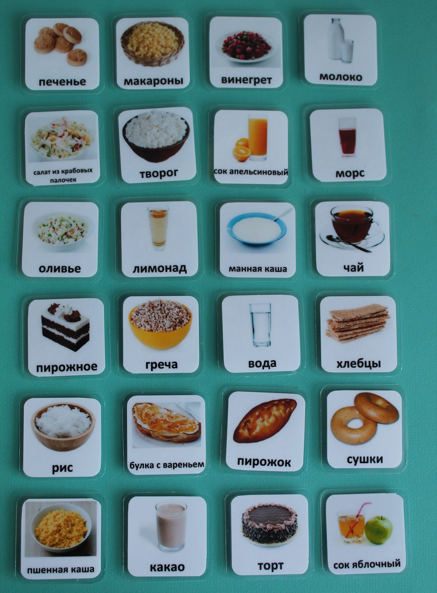 В комплект входят: рис, греча, макароны, печенье, пирожок, булка с вареньем, винегрет, оливье, салат из крабовых палочек, какао, молоко, лимонад, пирожное, торт, чай, апельсиновый сок, морс, вода, сушки, хлебцы, яблочный сок, творог, манная каша, пшённая каша.