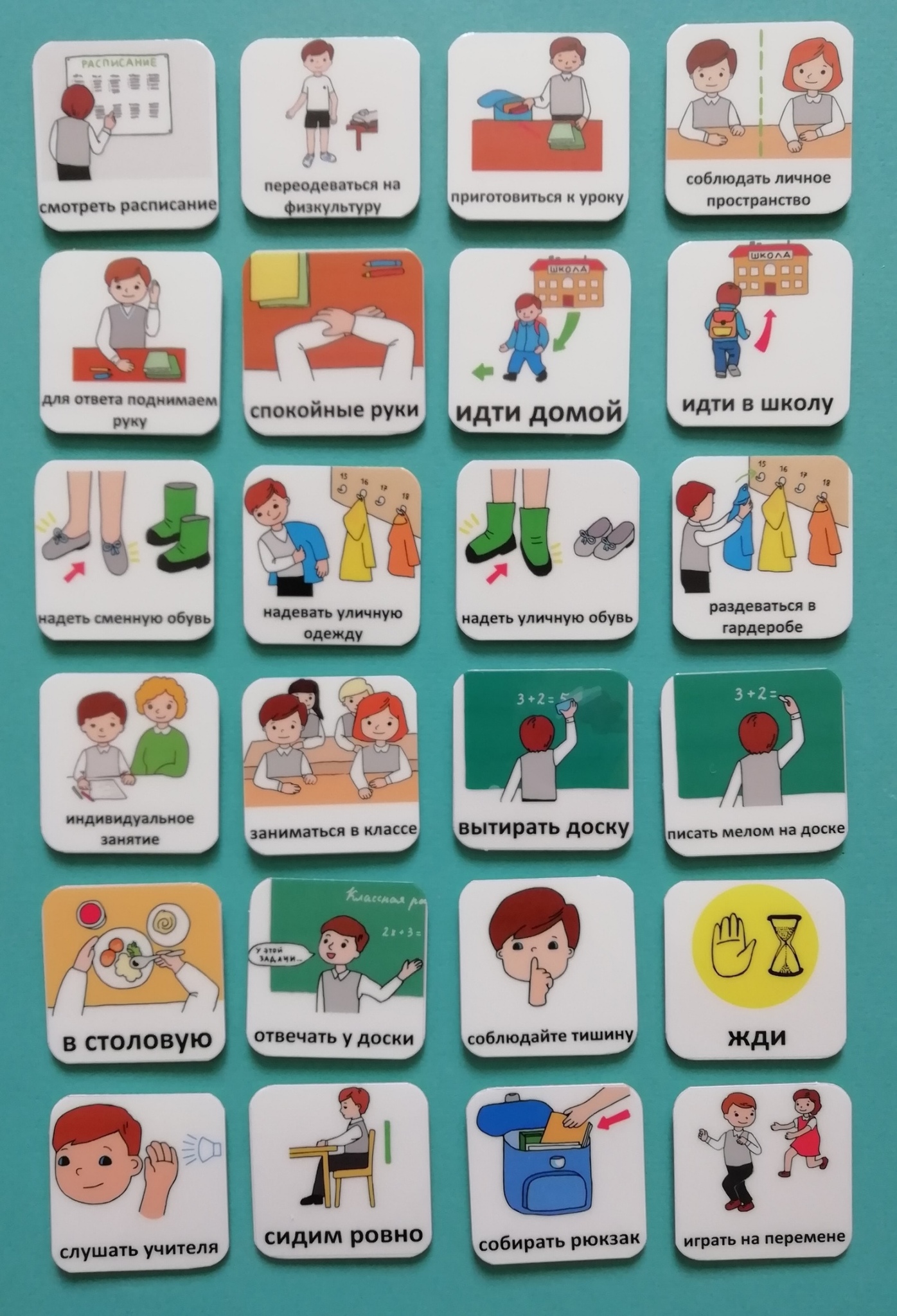 В комплект входят: 1. идти в школу, 2. вытирать доску, 3. играть на перемене, 4. соблюдайте тишину, 5. идти домой, 6. раздеваться в гардеробе, 7. в столовую, 8. индивидуальное занятие, 9. спокойные руки, 10. надевать уличную одежду, 11. слушать учителя, 12. для ответа поднимаем руку, 13. жди, 14. сидим ровно, 15. переодеваться на физкультуру, 16. собирать рюкзак, 17. отвечать у доски, 18. надеть сменную обувь, 19. надеть уличную обувь, 20. заниматься в классе, 21. приготовиться к уроку, 22. писать мелом на доске, 23. смотреть расписание, 24. соблюдать личное пространство