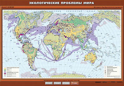 Штриховым знаком на карте показывается арктическое опустынивание, цветными фонами – аридное опустынивание, обезлесение, нефтяное загрязнение, сильно загрязненные районы мирового океана. Значками показаны крупные разливы нефти, подводные свалки мусора, радиоактивное загрязнение, выпадение кислотных дождей, комплексное нарушение земель, загрязнение атмосферы, деградация пастбищ, ветровая и водные эрозии.