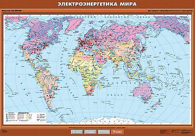 На карте даны тепловые электростанции, гидроэлектростанции, атомные электростанции мира. Размером знака выделены электростанции мощностью 5 мВт и более и группы электростанций. Фоном дано производство электроэнергии на душу населения по странам.Односторонняя печать, двустороннее ламинирование, лицевая сторона покрыта матовым ламинатом.