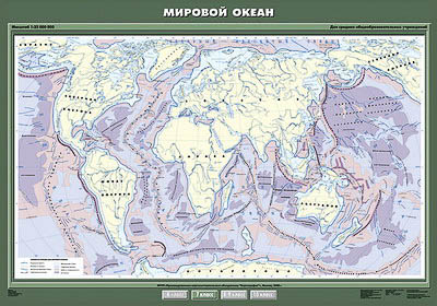 На карте даются элементы дна мирового океана: хребты, разломы и трещины, границы материковой отмели, глубоководные желоба, материковая отмель, подводные равнины, хребты и возвышенности, котловины.