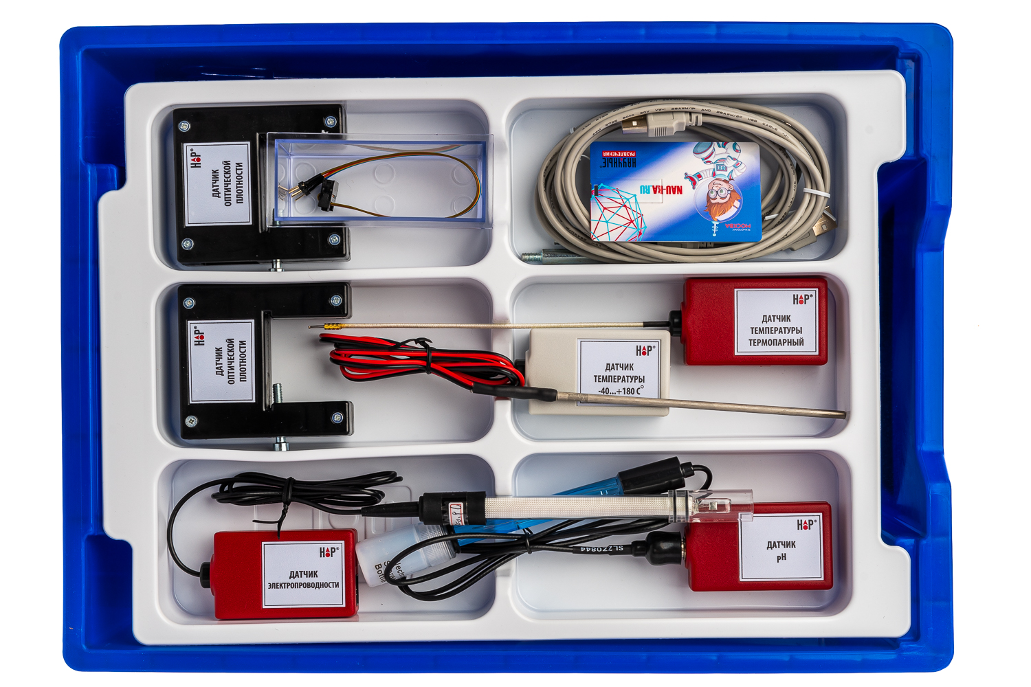 Состав — Комплект беспроводной передачи данных — Цифровой Р-датчик электропроводности (диапазон измерений от 0 до 10 мСм/см) — Цифровой Р-датчик температуры термопарный (диапазон измерений от -100 до +1000 градусов Цельсия) — Цифровой Р-датчик рН (диапазон измерений от 0 до 14 ед. pH при 20 градусах Цельсия) — Цифровой Р-датчик оптической плотности 525 нм (диапазон измерений от 0 до 2 ед. оптической плотности) — Цифровой датчик температуры химический (диапазон измерений от -40 до +180 градусов Цельсия) — Цифровой Р-датчик оптической плотности 590 нм (диапазон измерений от 0 до 2 ед. оптической плотности) — Держатель датчика (2 штуки) — Кабель соединительный USB (2 штуки) — Кабель соединительный для IDC разъема — Весы электронные лабораторные (максимальный предел взвешивания 200 грамм) — Кювета (2 шт.) — Набор лабораторной оснастки — Методическое обеспечение — Программное обеспечение для проведения экспериментов — Система хранения Цифровая лаборатория укомплектована в пластиковую систему хранения, которая закрывается прозрачной пластиковой крышкой на защелках для обеспечения наблюдения за содержимым. Комплект оборудования и датчики в системе хранения располагаются на ложементах.