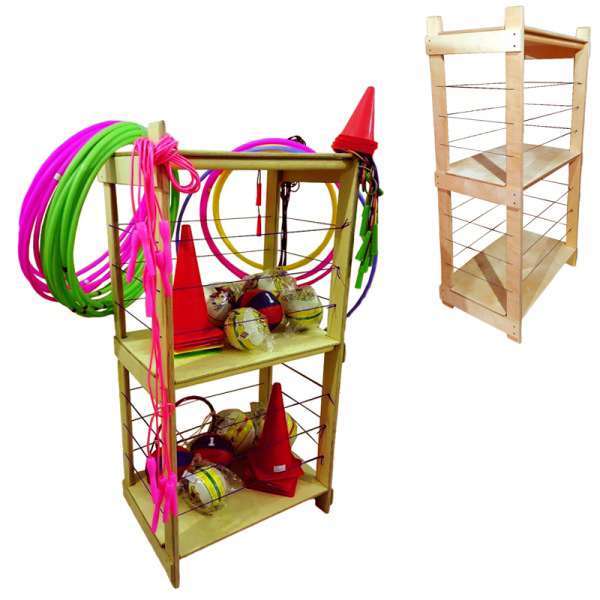 Стеллаж-стойку удобно использовать для хранения игрушек или мячей. Дизайн изделия позволяет поставить стеллаж как в игровую комнату, так и в спортивный зал. Возможно изготовление стеллажей других размеров, в том числе, цветных.