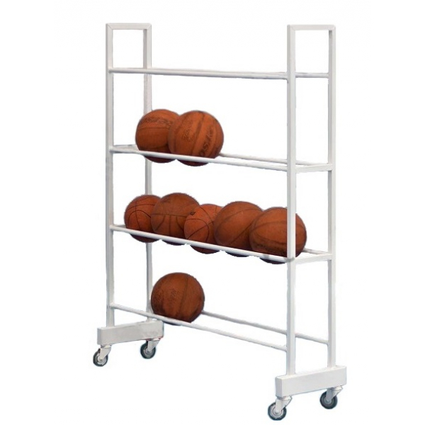 Конструкция тележки для перевозки мячей позволяет использовать её одновременно и как стеллаж для хранения мячей, изготавливается для мячей различного диаметра №5 (футбол, волейбол) и №7 (баскетбол), стандартная емкость 20 мячей (4 ряда по 5 мячей), снабжена колесами для удобства транспортировки, цвет (белый, серый, синий, зеленый или по выбору заказчика).